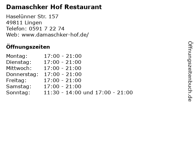 | Öffnungszeiten Damaschker Hof Restaurant in Lingen anzeigen | |