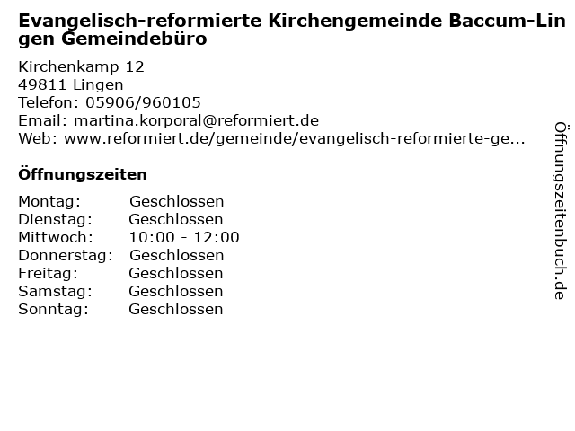 Branchen & Suchbegriffe zu Evangelisch-reformierte Kirchengemeinde Baccum-Lingen Gemeindebüro:baccum, evangelisch, gemeinde, gemeindebüro, gottesdienst, kirche, kirchengemeinde, lingen, pfarrer, reformierte, samtgemeinde |