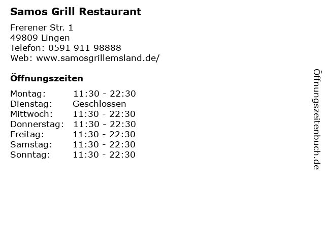| Öffnungszeiten Samos Grill Restaurant in Lingen anzeigen | |