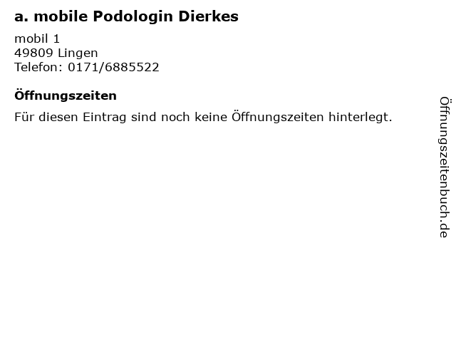 | Öffnungszeiten a. mobile Podologin Dierkes in Lingen anzeigen | |