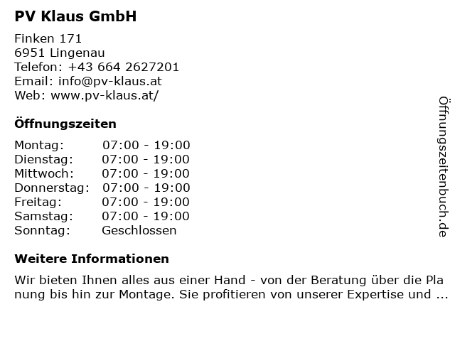 | Öffnungszeiten PV Klaus GmbH in Lingenau anzeigen | |