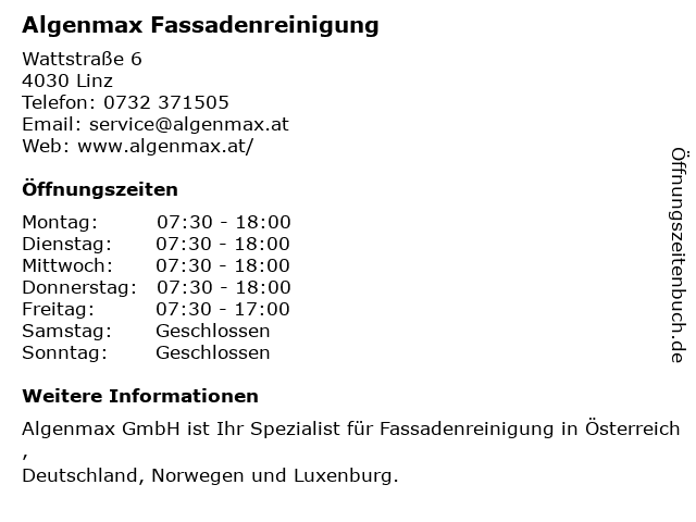 | Öffnungszeiten Algenmax Fassadenreinigung in Linz anzeigen | |