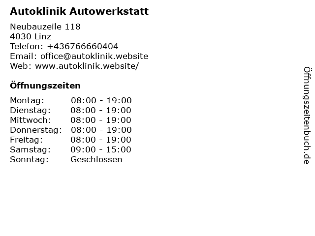 | Öffnungszeiten Autoklinik Autowerkstatt in Linz anzeigen | |