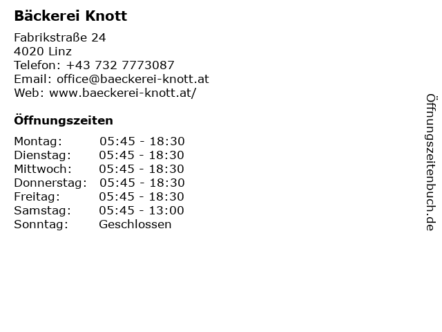 | Öffnungszeiten Bäckerei Knott in Linz anzeigen | |