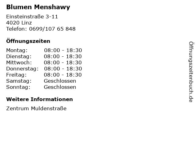 | Öffnungszeiten Blumen Menshawy in Linz anzeigen | |