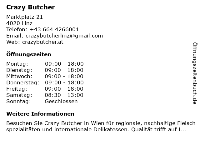 | Öffnungszeiten Crazy Butcher in Linz anzeigen | |