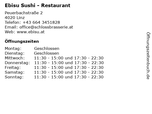 | Öffnungszeiten Ebisu Sushi - Restaurant in Linz anzeigen | |