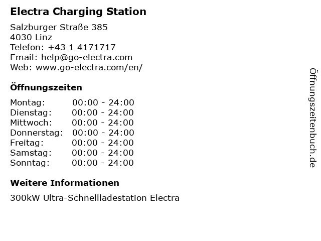 | Öffnungszeiten Electra Charging Station in Linz anzeigen | |