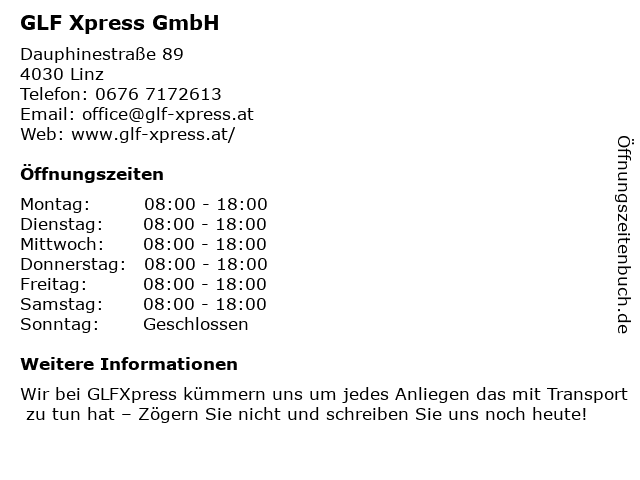 | Öffnungszeiten GLF Xpress GmbH in Linz anzeigen | |