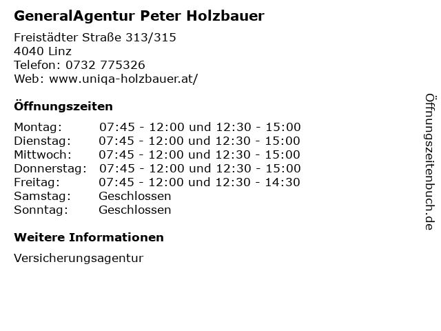 | Öffnungszeiten GeneralAgentur Peter Holzbauer in Linz anzeigen | |