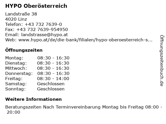 | Öffnungszeiten HYPO Oberösterreich in Linz anzeigen | |