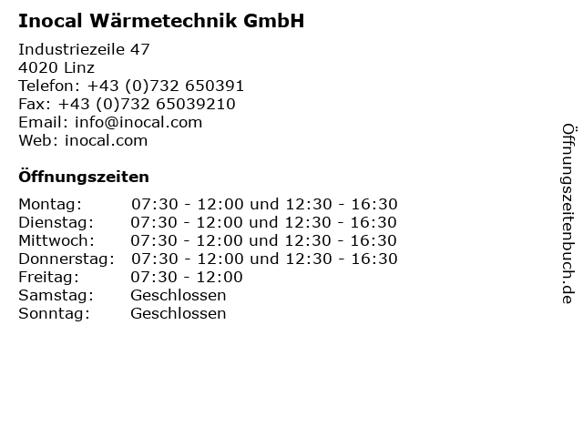 | Öffnungszeiten Inocal Wärmetechnik GmbH in Linz anzeigen | |