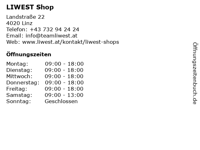 | Öffnungszeiten LIWEST Shop in Linz anzeigen | |