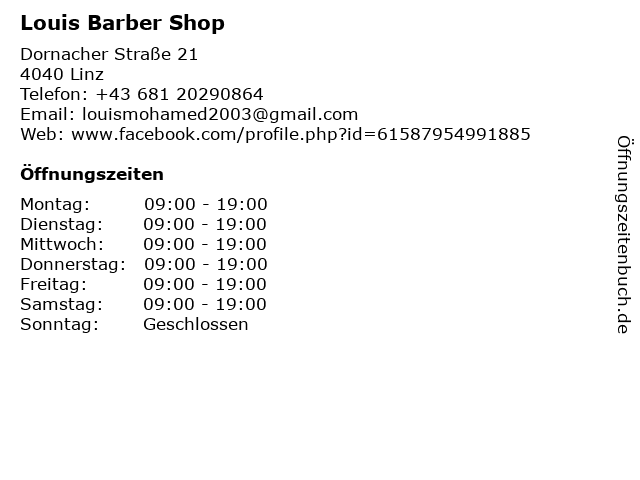 | Öffnungszeiten Louis Barber Shop in Linz anzeigen | |