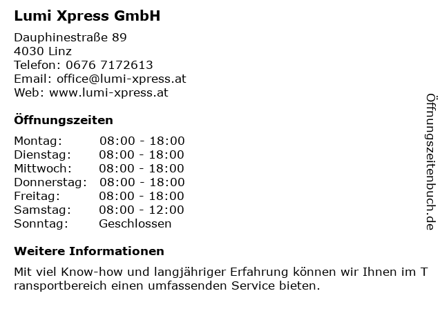 | Öffnungszeiten Lumi Xpress GmbH in Linz anzeigen | |