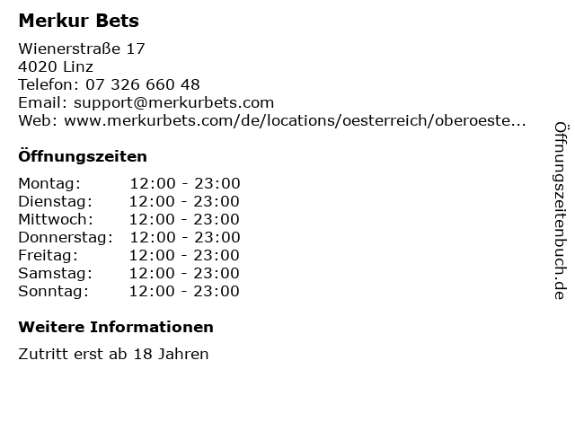 | Öffnungszeiten Merkur Bets in Linz anzeigen | |