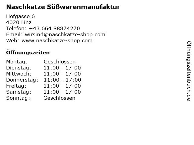 | Öffnungszeiten Naschkatze Süßwarenmanufaktur in Linz anzeigen | |