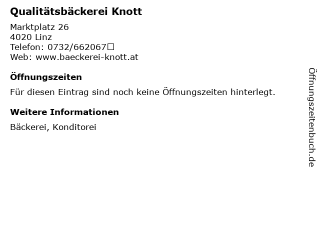 | Öffnungszeiten Qualitätsbäckerei Knott in Linz anzeigen | |
