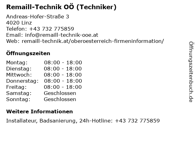 | Öffnungszeiten Remaill-Technik OÖ (Techniker) in Linz anzeigen | |