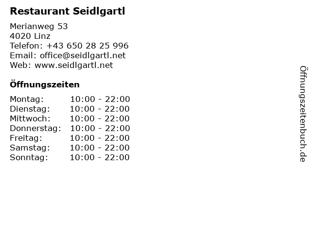 | Öffnungszeiten Restaurant Seidlgartl in Linz anzeigen | |