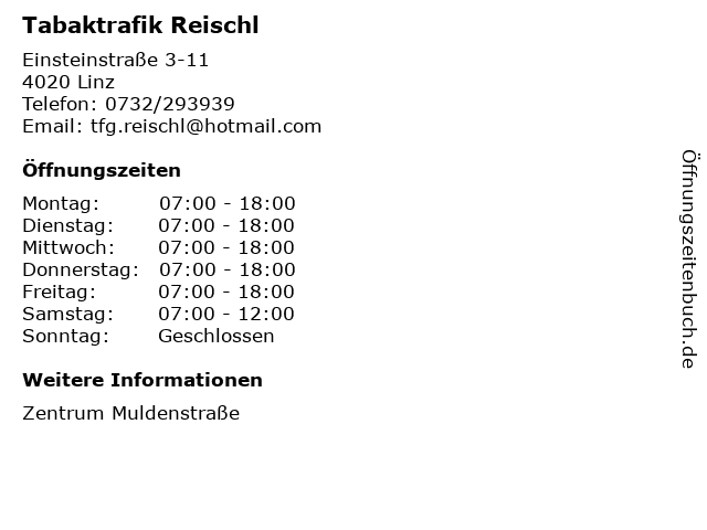 | Öffnungszeiten Tabaktrafik Reischl in Linz anzeigen | |