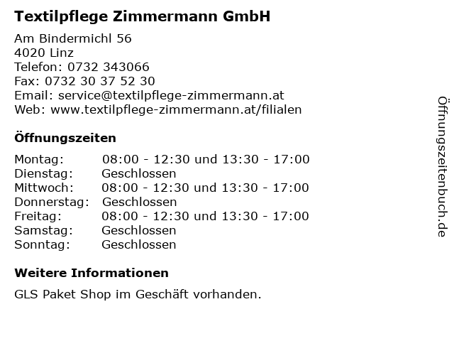 | Öffnungszeiten Textilpflege Zimmermann GmbH in Linz anzeigen | |