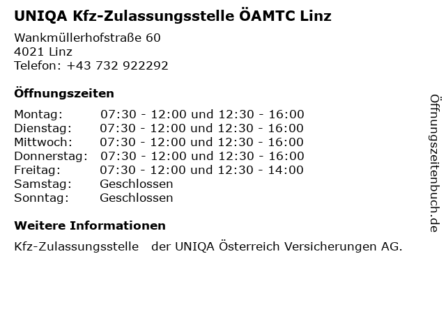 2 UNIQA Versicherungen AG - Besichtigungsstelle (ÖAMTC) (Entfernung: 0,03 km) Wankmüllerhofstr 60, 4021 Linz 5 UNIQA Österreich Versicherungen AG - Landesdirektion Oberösterreich (Beratung | Service | KFZ-Zulassung) (Entfernung: 2,16 km) Europaplatz 5, 4020 Linz 6 Uniqa Versicherungen - ServiceCenter Linz Urfahr (KFZ Zulassung) (Entfernung: 3,97 km) Wildbergstraße 8, 4040 Linz |