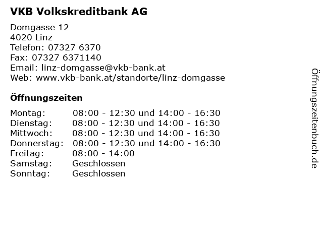 | Öffnungszeiten VKB Volkskreditbank AG in Linz anzeigen | |