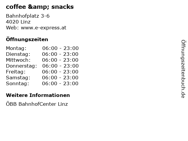 | Öffnungszeiten coffee & snacks in Linz anzeigen | |