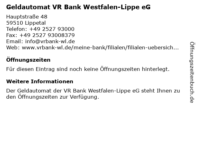 Geldautomat VR Bank Westfalen-Lippe eG in Lippetal: Telefonnummer, Öffnungszeiten und Adresse
