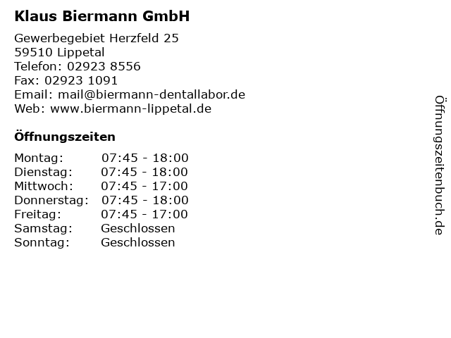 | Öffnungszeiten Klaus Biermann GmbH in Lippetal anzeigen | |