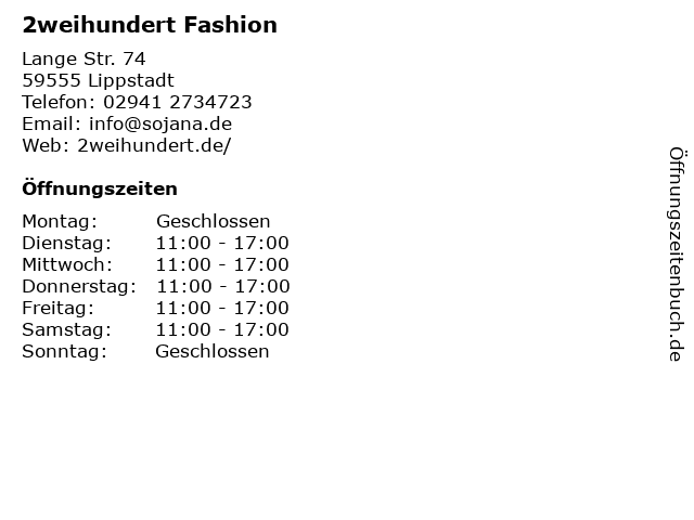 | Öffnungszeiten 2weihundert Fashion in Lippstadt anzeigen | |