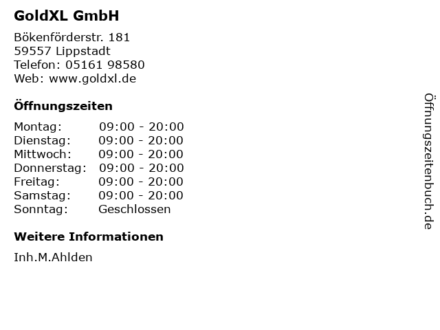 | Öffnungszeiten GoldXL GmbH in Lippstadt anzeigen | |