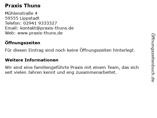 | Öffnungszeiten Praxis Thuns in Lippstadt anzeigen | |