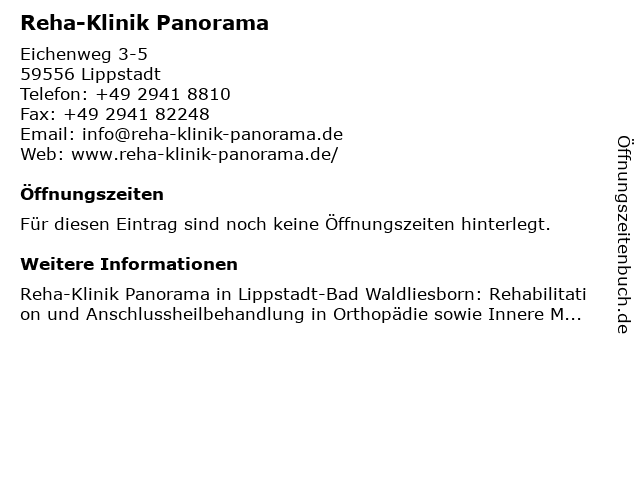 | Öffnungszeiten Reha-Klinik Panorama in Lippstadt anzeigen | |