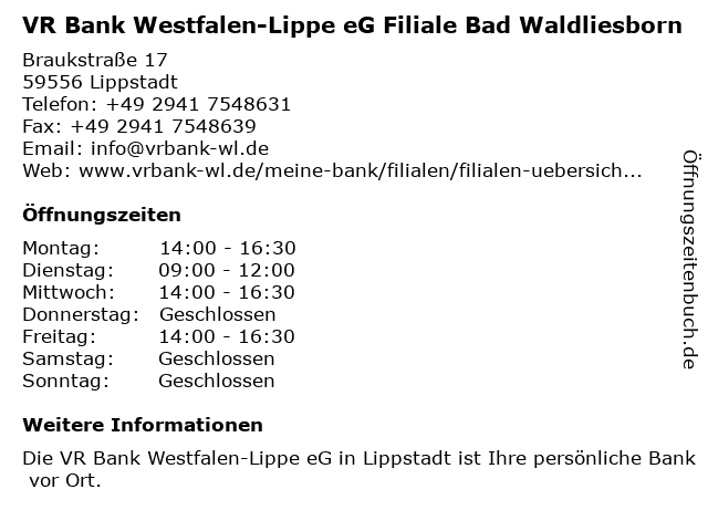 Branchen & Suchbegriffe zu VR Bank Westfalen-Lippe eG Filiale Bad Waldliesborn:altersvorsorge, bad, bank, baufinanzierung, bausparen, eg, geldanlage, geldautomat, girokonto, immobilien, kredit, lippe, online-banking, vr, waldliesborn, westfalen |