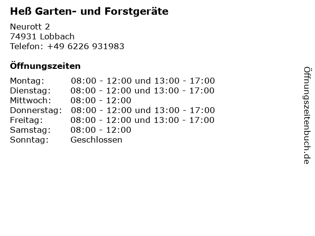 | Öffnungszeiten Heß Garten- und Forstgeräte in Lobbach anzeigen | |