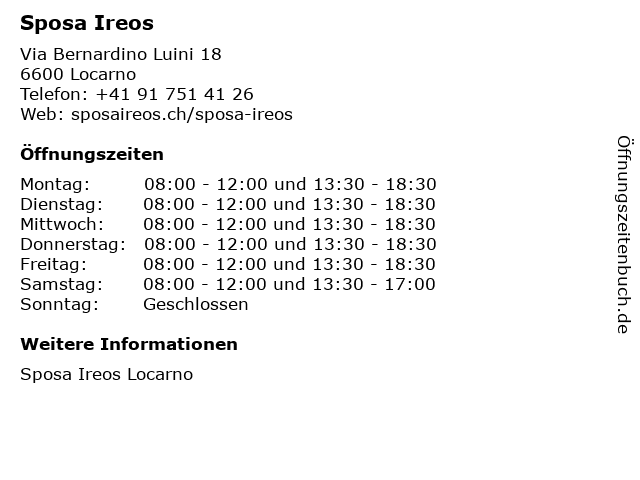 | Öffnungszeiten Sposa Ireos in Locarno anzeigen | |