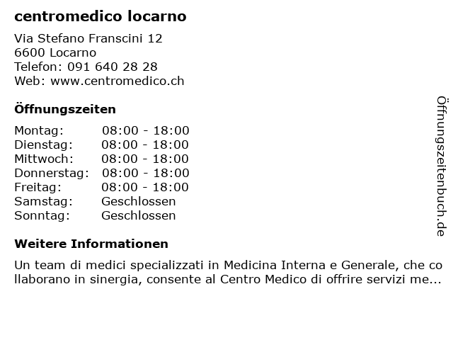 | Öffnungszeiten centromedico locarno in Locarno anzeigen | |