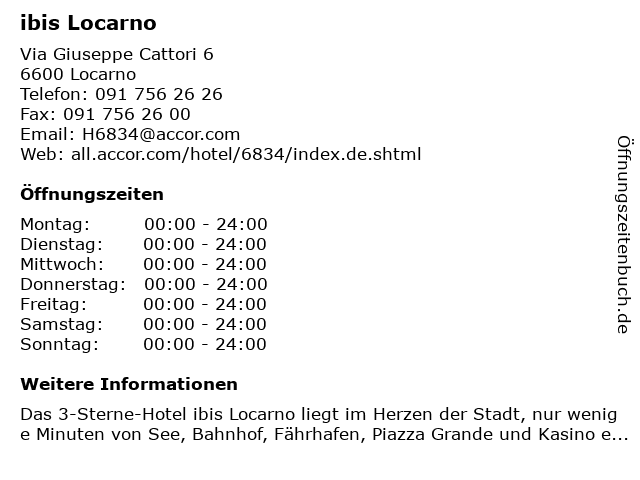 | Öffnungszeiten ibis Locarno in Locarno anzeigen | |