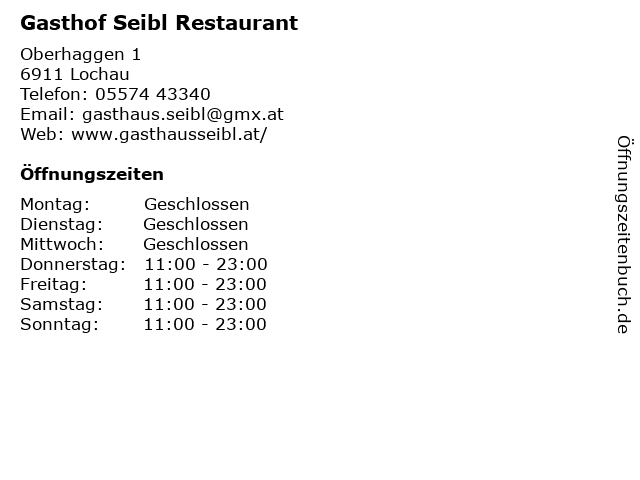 | Öffnungszeiten Gasthof Seibl Restaurant in Lochau anzeigen | |