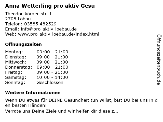 | Öffnungszeiten Anna Wetterling pro aktiv Gesu in Löbau anzeigen | |