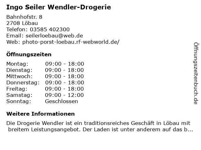 | Öffnungszeiten Ingo Seiler Wendler-Drogerie in Löbau anzeigen | |