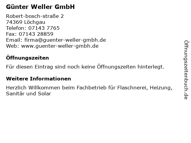 | Öffnungszeiten Günter Weller GmbH in Löchgau anzeigen | |