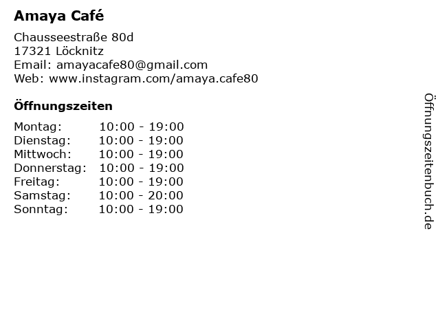 | Öffnungszeiten Amaya Café in Löcknitz anzeigen | |