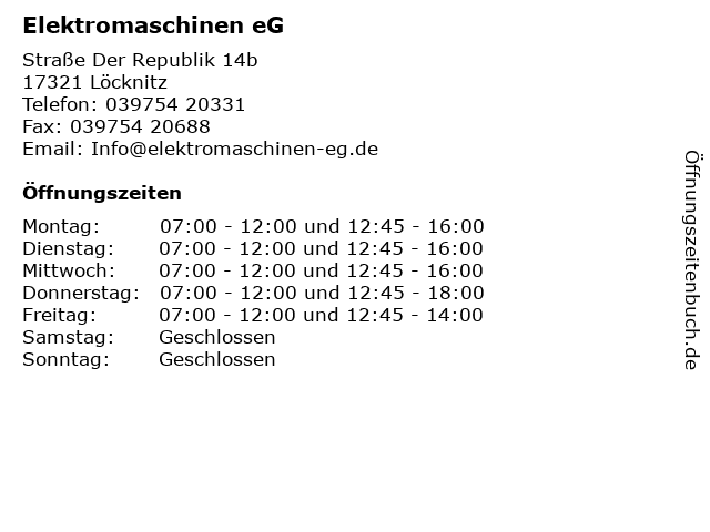 Öffnungszeiten Elektromaschinen eG in Löcknitz anzeigen | |