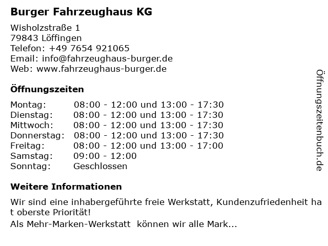 | Öffnungszeiten Burger Fahrzeughaus KG in Löffingen anzeigen | |