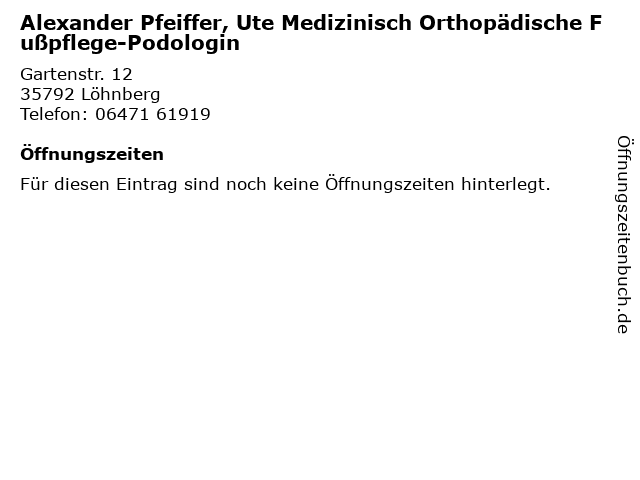 | Alexander Pfeiffer, Ute Medizinisch Orthopädische Fußpflege-Podologin anrufen | |