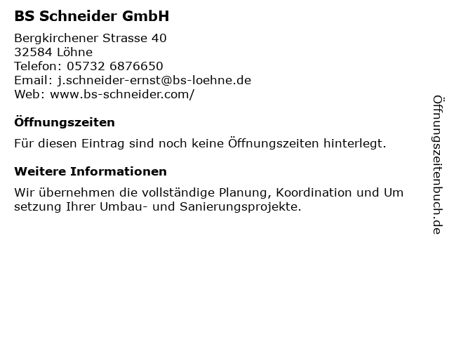 | Öffnungszeiten BS Schneider GmbH in Löhne anzeigen | |