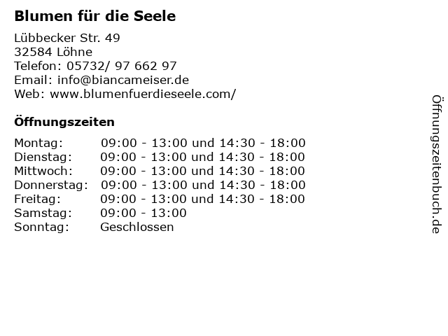 | Öffnungszeiten Blumen für die Seele in Löhne anzeigen | |